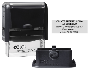 Przedmiotem oferty jest profesjonalna pieczątka z treścią Pieczątka Opłata Przerzucona na adresata – umowa z Pocztą Polską S.A. ID nr xxxxxxxx z dnia 24.02.2026r. Stempel przeznaczony jest do oznaczania przesyłek oraz dokumentów nadawczych zgodnie z wymogami współpracy z operatorem pocztowym. Zapewnia szybkie, czytelne i zgodne ze standardami oznaczenie korespondencji firmowej.